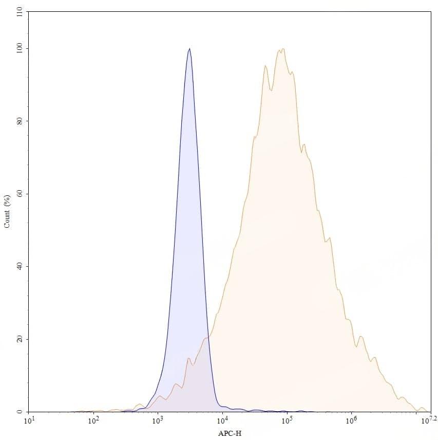 Flow-cytometry using APC anti-human CD51&CD61 antibody. HUVEC cells were stained with an irrelevant antibody (Blue Histogram) or an APC anti-human CD51&CD61 monoclonal antibody (Catalog No.:TD-HY065237, Yellow Histogram) at a concentration of 5 µg/ml for 30 mins at RT. After washing, and cells analysed on a NovoCyte Flow Cytometer.
