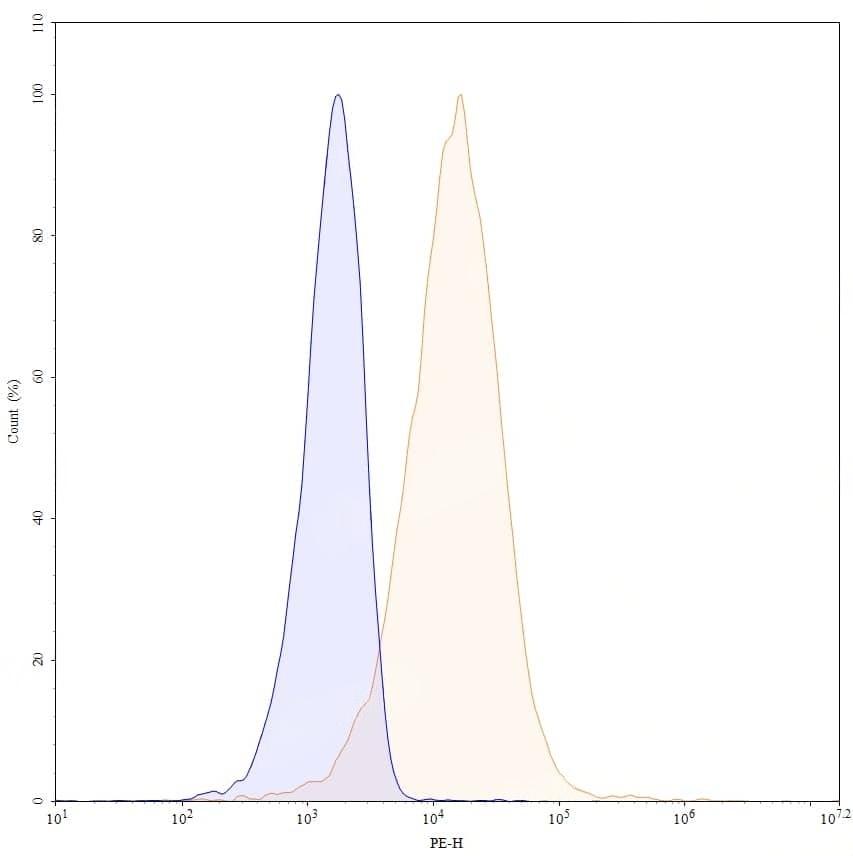 Flow-cytometry using PE anti-human CD3E antibody. Jurkat cells were stained with an irrelevant antibody (Blue Histogram) or an PE anti-human CD3E monoclonal antibody (Catalog No.:TD-HY057327, Yellow Histogram) at a concentration of 5 µg/ml for 30 mins at RT. After washing, and cells analysed on a NovoCyte Flow Cytometer.