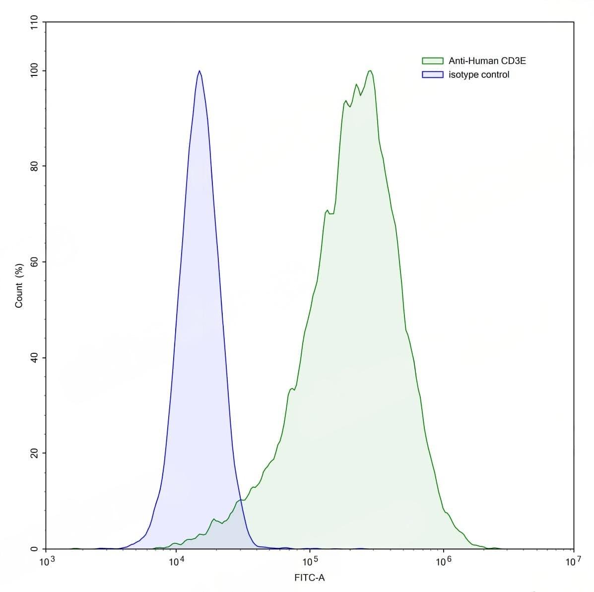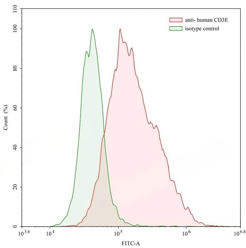SEC-HPLC detection for Anti-Human CD3E Antibody (OKT3). | Flow-cytometry using anti-human CD3E antibody. Human Jurkat cell line were stained with an irrelevant antibody (Green Histogram) or an anti-human CD3E antibody monoclonal antibody (Catalog No.:TD-HY057307 , Red Histogram) at a concentration of 20 µg/ml for 30 mins at RT. After washing, bound antibody was detected using a CoraLite488 conjugated goat anti-mouse antibody (Catalog No.:TD-MF690314) and cells analysed on a NovoCyte Flow Cytometer. | Flow-cytometry using anti-human CD3E antibody.Jurkat cells were stained with an irrelevant antibody (Blue Histogram) or an anti-human CD3E antibody monoclonal antibody (Catalog No.:TD-HY057307 ,Green Histogram) at a concentration of 5 µg/ml for 30 mins at RT. After washing, bound antibody was detected using a FITC conjugated goat anti-mouse antibody (Catalog No.:TD-MF690414) and cells analysed on a NovoCyte Flow Cytometer.