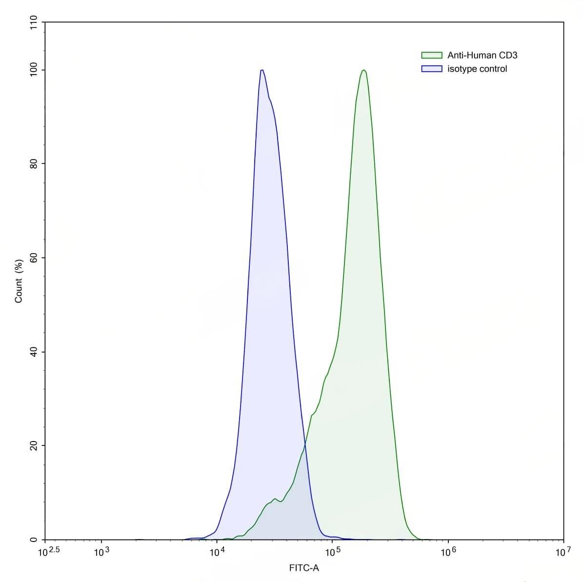 SEC-HPLC detection for Anti-Human CD3E Antibody (YTH12.5). | Flow-cytometry using anti-human CD3E antibody.CD3E Transfected CHO cells were stained with an irrelevant antibody (Blue Histogram) or an anti-human CD3E antibody monoclonal antibody (Catalog No.:TD-HY057107 ,Green Histogram) at a concentration of 5 µg/ml for 30 mins at RT. After washing, bound antibody was detected using a FITC conjugated goat anti-mouse antibody (Catalog No.:TD-MF690414) and cells analysed on a NovoCyte Flow Cytometer. | SDS-PAGE for Anti-Human CD3E Antibody (YTH12.5).
