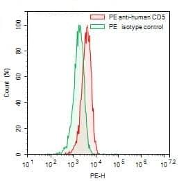 Flow-cytometry using PE anti-human CD5 antibody. Jurkat cells were stained with an irrelevant antibody (Green Histogram) or a PE anti-human CD5 antibody monoclonal antibody (Catalog No.:TD-HY046127, Red Histogram) at a concentration of 5 µg/ml for 30 mins at RT. After washing, cells analysed on a NovoCyte Flow Cytometer.