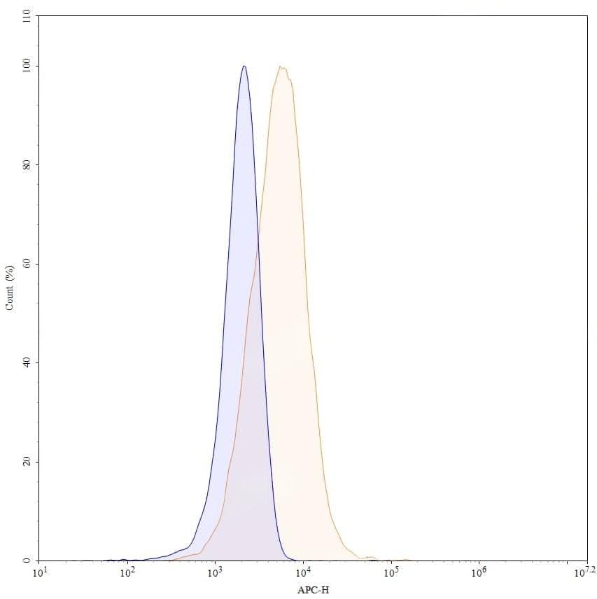 Flow-cytometry using APC anti-human CD1a antibody. Jurkat cells were stained with an irrelevant antibody (Blue Histogram) or an APC anti-human CD1a monoclonal antibody (Catalog No.:TD-HY043137, Yellow Histogram) at a concentration of 5 µg/ml for 30 mins at RT. After washing, and cells analysed on a NovoCyte Flow Cytometer.