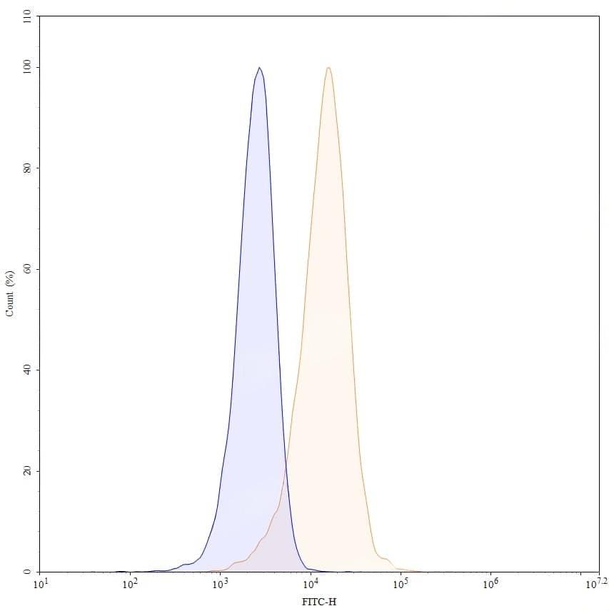 Flow-cytometry using FITC anti-human CD1a antibody. Jurkat cells were stained with an irrelevant antibody (Blue Histogram) or an FITC anti-human CD1a monoclonal antibody (Catalog No.:TD-HY043117, Yellow Histogram) at a concentration of 5 µg/ml for 30 mins at RT. After washing, and cells analysed on a NovoCyte Flow Cytometer.