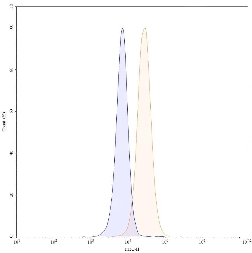 Flow-cytometry using FITC anti-human CD71 antibody. U937 cells were stained with an irrelevant antibody (Blue Histogram) or an FITC anti-human CD71 monoclonal antibody (Catalog No.:TD-HY036217, Yellow Histogram) at a concentration of 5 µg/ml for 30 mins at RT. After washing, and cells analysed on a NovoCyte Flow Cytometer.