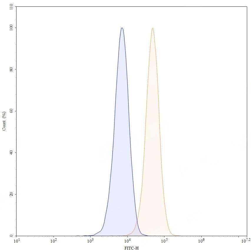 Flow-cytometry using FITC anti-human CD71 antibody. U937 cells were stained with an irrelevant antibody (Blue Histogram) or an FITC anti-human CD71 monoclonal antibody (Catalog No.:TD-HY036117, Yellow Histogram) at a concentration of 5 µg/ml for 30 mins at RT. After washing, cells analysed on a NovoCyte Flow Cytometer.