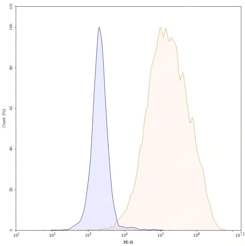 Flow-cytometry PE using anti-human ROR2 antibody. Untransfected cells (blue Histogram) and Transfected cells (Yellow Histogram) were stained with an PE anti-human ROR2 monoclonal antibody (Catalog No.:TD-HX930127) at a concentration of 5 µg/ml for 30 mins at RT. After washing, cells analysed on a NovoCyte Flow Cytometer.