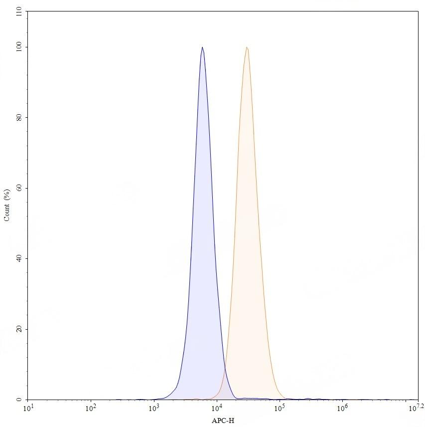 Flow-cytometry using APC anti-human CD172a antibody. U937 cells were stained with an irrelevant antibody (Blue Histogram) or an APC anti-human CD172a monoclonal antibody (Catalog: TD-HX892137, Yellow Histogram) at a concentration of 5 µg/ml for 30 mins at RT. After washing, and cells analysed on a NovoCyte Flow Cytometer.