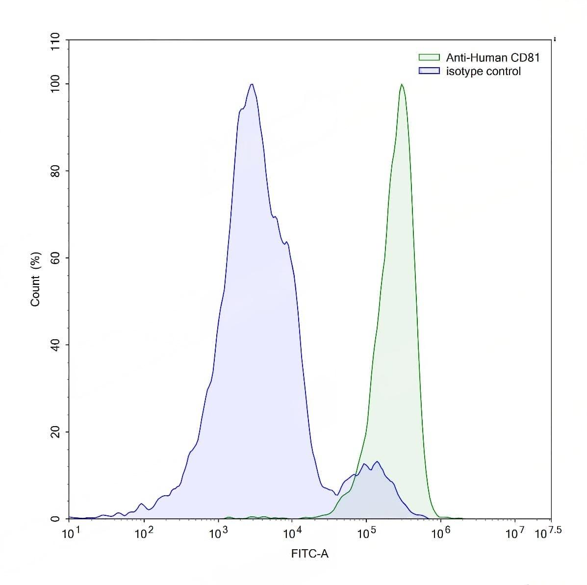 Detects CD81 in indirect ELISAs. | Flow-cytometry using anti-human CD81 antibody.Human peripheral blood lymphocytes were stained with an irrelevant antibody (Blue Histogram) or an anti-human CD81 antibody monoclonal antibody (Catalog No.:TD-HX855107 ,Green Histogram) at a concentration of 5 µg/ml for 30 mins at RT. After washing, bound antibody was detected using a FITC conjugated goat anti-mouse antibody (Catalog No.:TD-MF690414) and cells analysed on a NovoCyte Flow Cytometer. | Western blot analysis was performed using anti-CD81 monoclonal antibody at 1ug/mL on various samples.Lane 1:recombinant human CD81 (Catalog No.:TD-HX855011)Lane 2:negative control