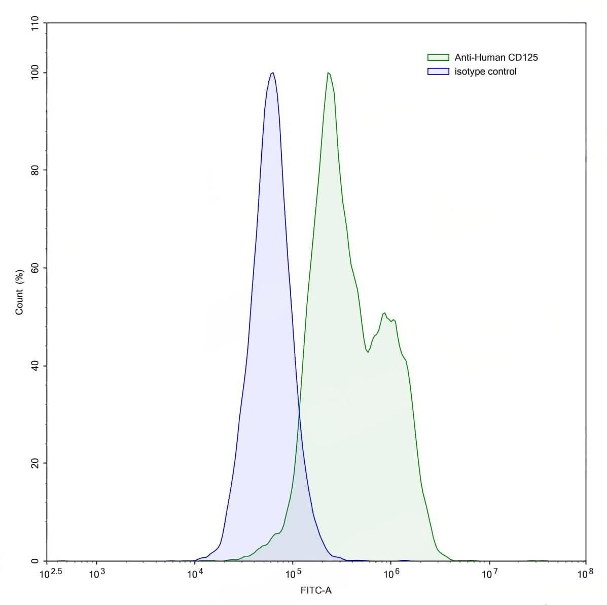 Flow-cytometry using anti-human CD125 antibody.CD125 Transfected CHO cells were stained with an irrelevant antibody (Blue Histogram) or an anti-human CD125 antibody monoclonal antibody (Catalog No.:TD-HX243107 ,Green Histogram) at a concentration of 5 µg/ml for 30 mins at RT. After washing, bound antibody was detected using a FITC conjugated goat anti-mouse antibody (Catalog No.:TD-MF690414) and cells analysed on a NovoCyte Flow Cytometer.