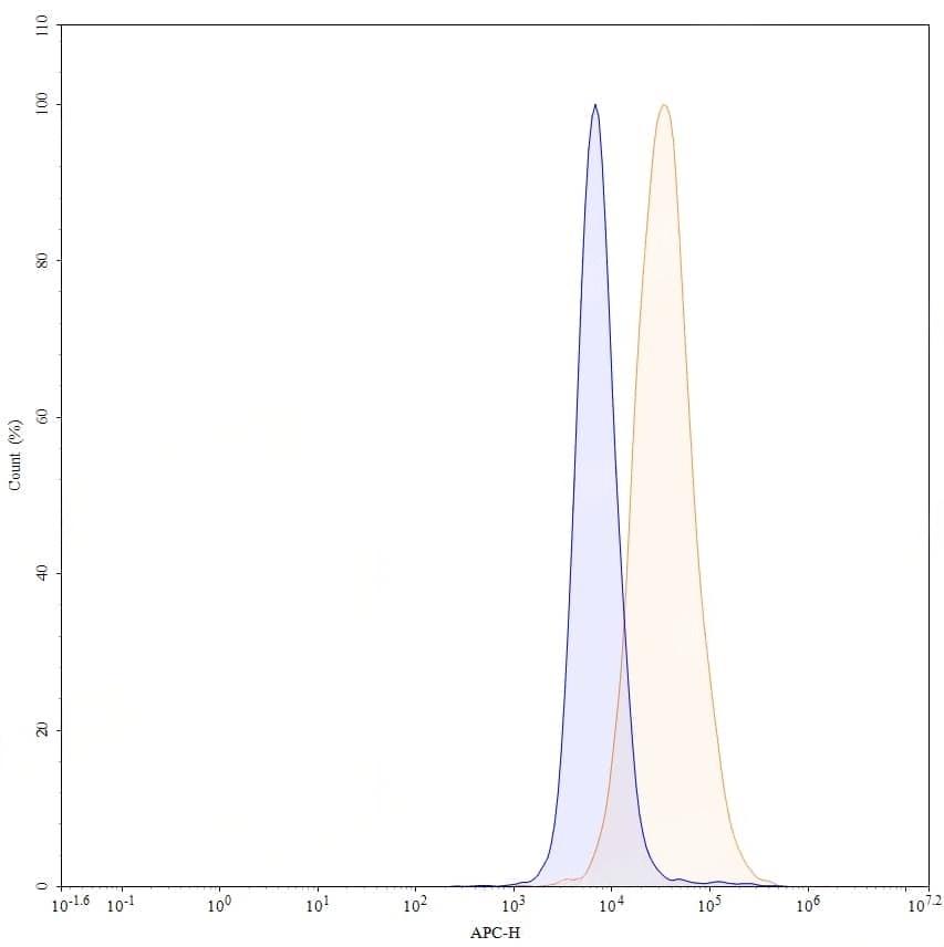 Flow-cytometry using APC anti-human CD339 antibody. HepG-2 cells were stained with an irrelevant antibody (Blue Histogram) or an APC anti-human CD339 monoclonal antibody (Catalog No.:TD-HX118137, Yellow Histogram) at a concentration of 5 µg/ml for 30 mins at RT. After washing, and cells analysed on a NovoCyte Flow Cytometer.