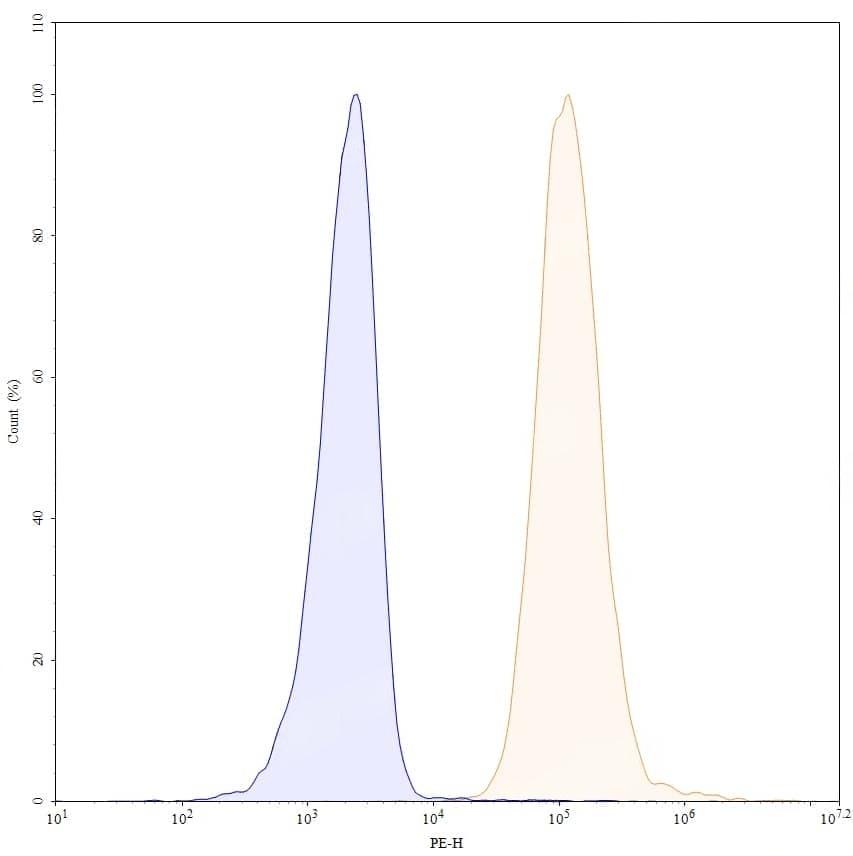 Flow-cytometry using PE anti-human CD86 antibody. Daudi cells were stained with an irrelevant antibody (Blue Histogram) or an PE anti-human CD86 monoclonal antibody (Catalog No.:TD-HW776227, Yellow Histogram) at a concentration of 5 µg/ml for 30 mins at RT. After washing, cells analysed on a NovoCyte Flow Cytometer.