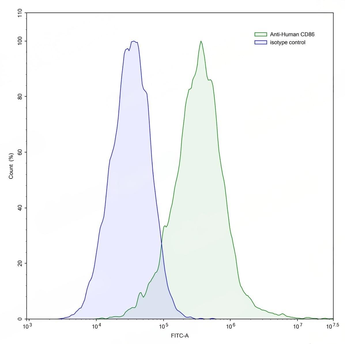 Detects Human CD86/B7-2 in indirect ELISAs. | Flow-cytometry using anti-human CD86 antibody.Daudi cells were stained with an irrelevant antibody (Blue Histogram) or an anti-human CD86 antibody monoclonal antibody (Catalog No.:TD-HW776207 ,Green Histogram) at a concentration of 5 µg/ml for 30 mins at RT. After washing, bound antibody was detected using a FITC conjugated goat anti-mouse antibody (Catalog No.:TD-MF690414) and cells analysed on a NovoCyte Flow Cytometer. | Flow-cytometry using anti-human CD86 antibody.K562 cells were stained with an irrelevant antibody (Blue Histogram) or an anti-human CD86 antibody monoclonal antibody (Catalog No.:TD-HW776207 ,Green Histogram) at a concentration of 5 µg/ml for 30 mins at RT. After washing, bound antibody was detected using a FITC conjugated goat anti-mouse antibody (Catalog No.:TD-MF690414) and cells analysed on a NovoCyte Flow Cytometer.