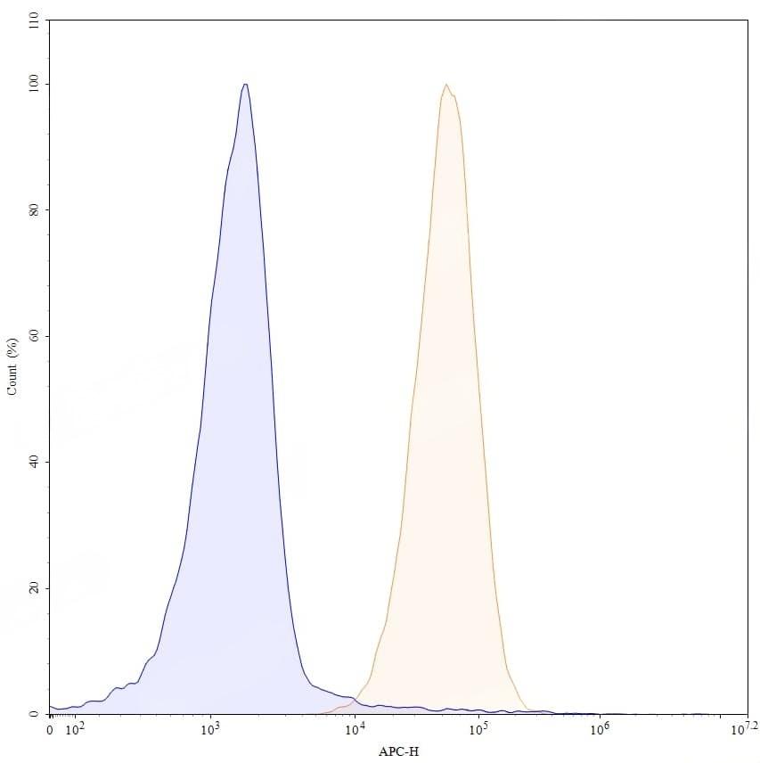 Flow-cytometry using APC anti-human CD70 antibody. Raji cells were stained with an irrelevant antibody (Blue Histogram) or an APC anti-human CD70 monoclonal antibody (Catalog No.:TD-HW717237, Yellow Histogram) at a concentration of 5 µg/ml for 30 mins at RT. After washing, and cells analysed on a NovoCyte Flow Cytometer.