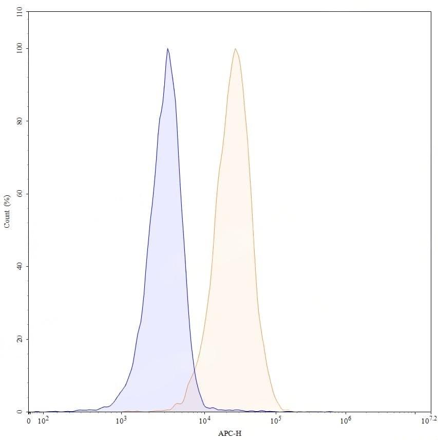 Flow-cytometry using APC anti-human CD70 antibody. Raji cells were stained with an irrelevant antibody (Blue Histogram) or an APC anti-human CD70 monoclonal antibody (Catalog No.:TD-HW717137, Yellow Histogram) at a concentration of 5 µg/ml for 30 mins at RT. After washing, and cells analysed on a NovoCyte Flow Cytometer.