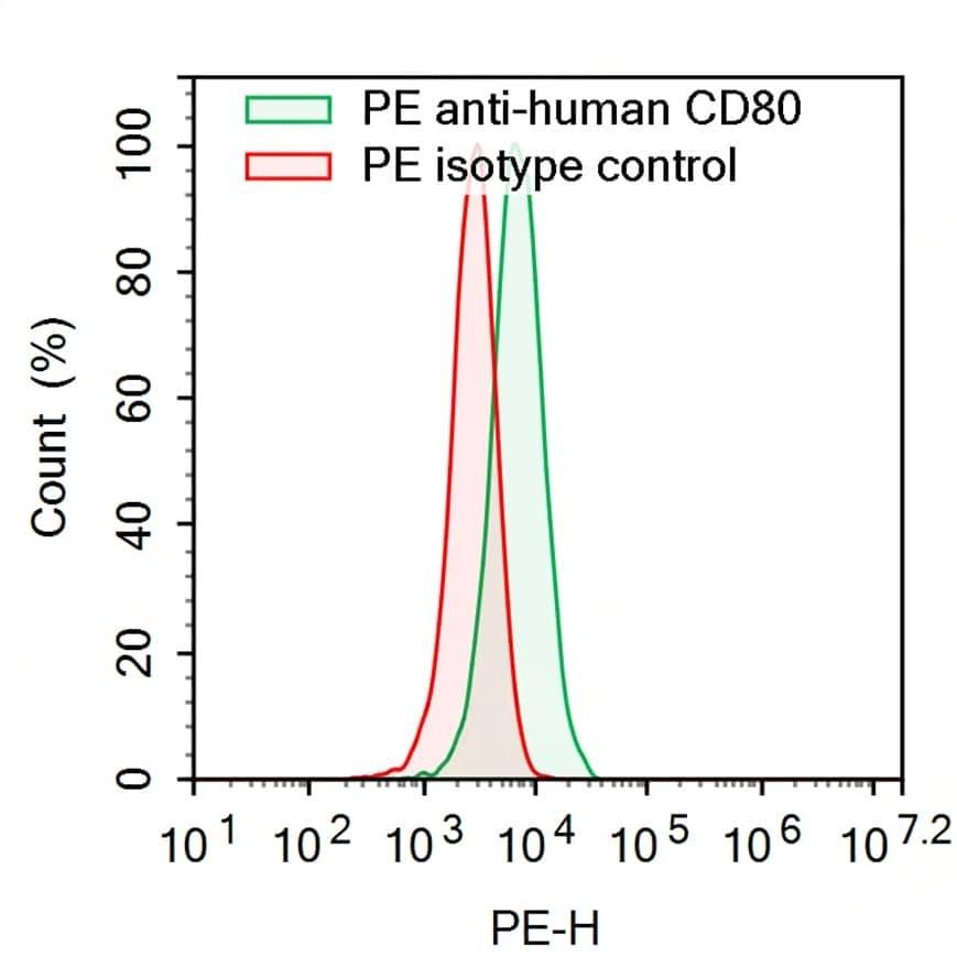 Flow-cytometry using PE anti-Human CD80 antibody. Raji cells were stained with an irrelevant antibody (Red Histogram) or a PE anti-Human CD80 antibody monoclonal antibody (Catalog No.:TD-HW630227 , Green Histogram) at a concentration of 5 µg/ml for 30 mins at RT. After washing, cells analysed on a NovoCyte Flow Cytometer.