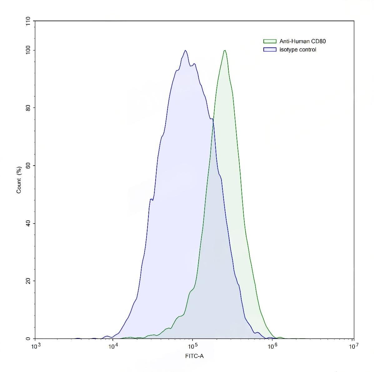 Flow-cytometry using anti-human CD80 antibody.Raji cells were stained with an irrelevant antibody (Blue Histogram) or an anti-human CD80 antibody monoclonal antibody (Catalog No.:TD-HW630107 ,Green Histogram) at a concentration of 5 µg/ml for 30 mins at RT. After washing, bound antibody was detected using a FITC conjugated goat anti-mouse antibody (Catalog No.:TD-MF690414) and cells analysed on a NovoCyte Flow Cytometer.