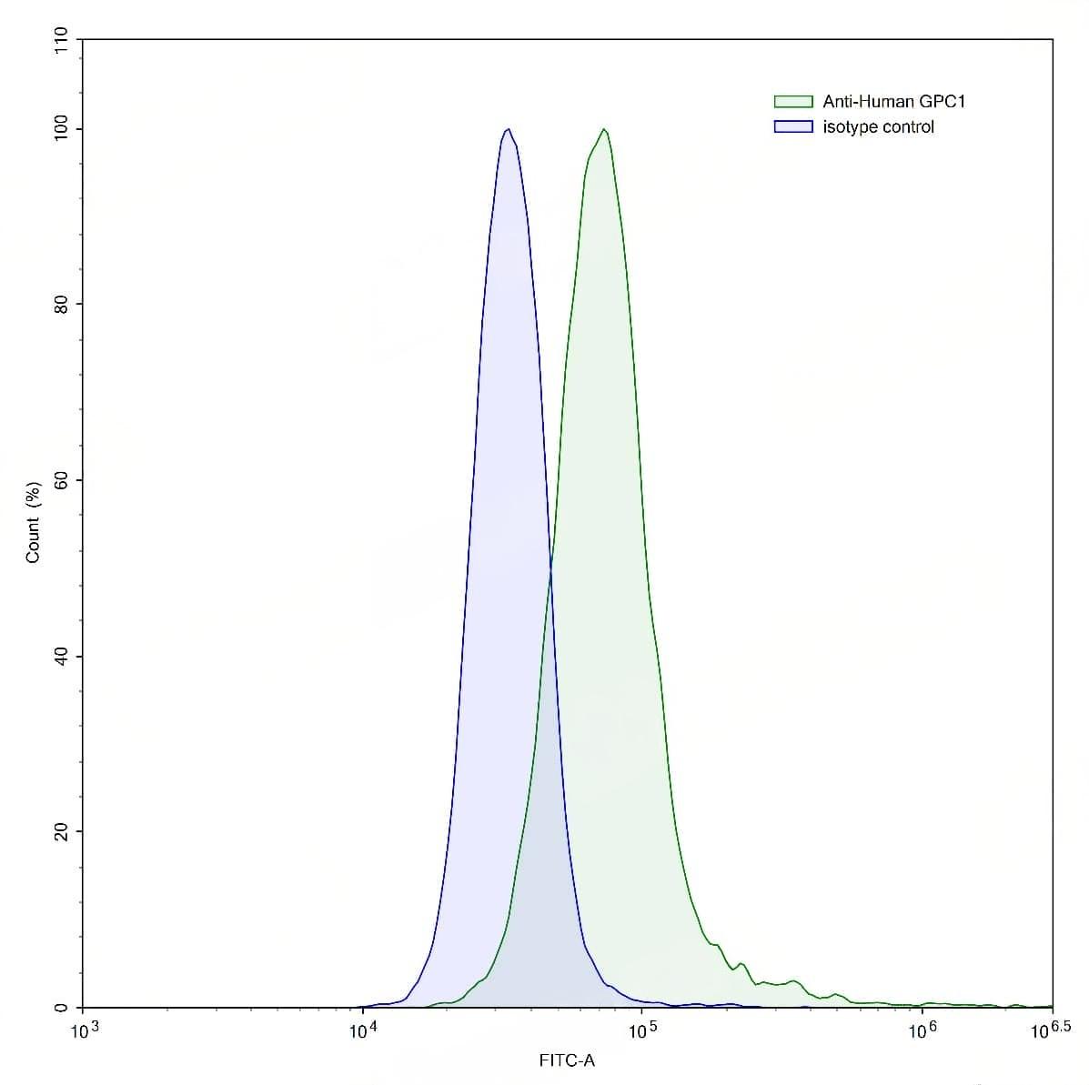 Flow-cytometry using anti-human GPC1 antibody.A431 cells were stained with an irrelevant antibody (Blue Histogram) or an anti-human GPC1 antibody monoclonal antibody (Catalog No.:TD-HW614107 ,Green Histogram) at a concentration of 5 µg/ml for 30 mins at RT. After washing, bound antibody was detected using a FITC conjugated goat anti-human antibody (Catalog No.:TD-HF690414) and cells analysed on a NovoCyte Flow Cytometer.