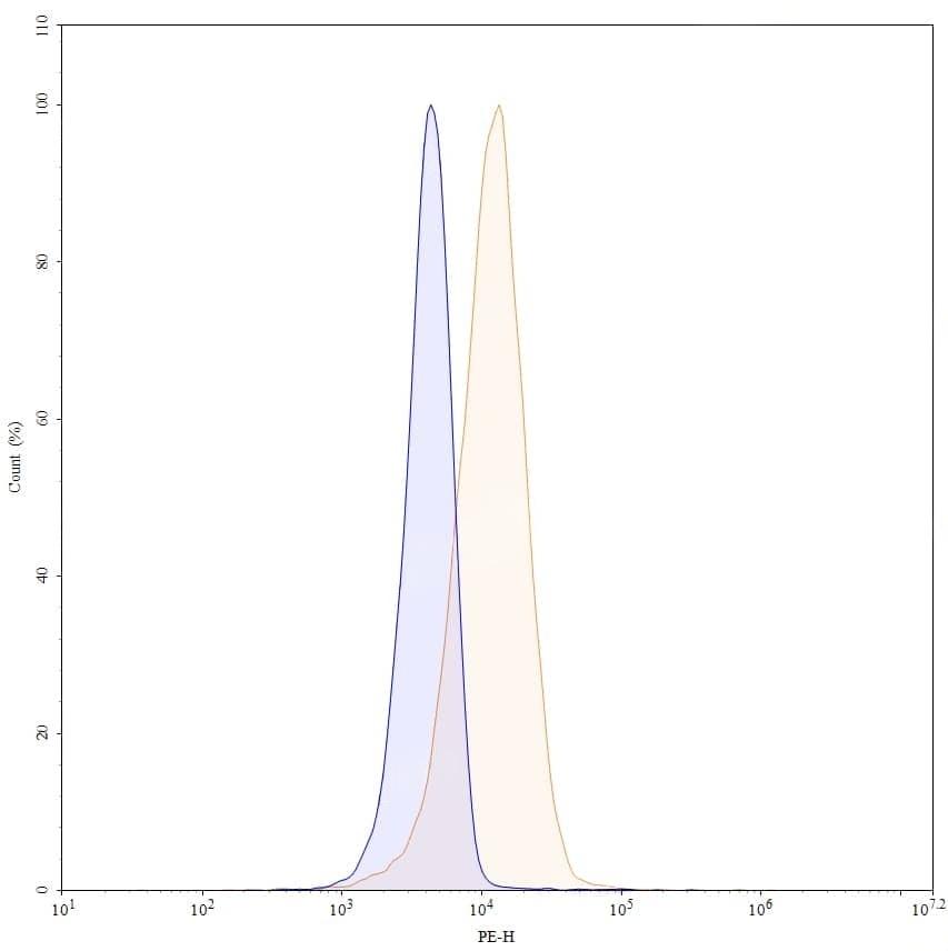 Flow-cytometry using PE anti-human DSG3 antibody. HaCaT cells were stained with an irrelevant antibody (Blue Histogram) or an PE anti-human DSG3 monoclonal antibody (Catalog No.:TD-HW575127, Yellow Histogram) at a concentration of 5 µg/ml for 30 mins at RT. After washing, and cells analysed on a NovoCyte Flow Cytometer.