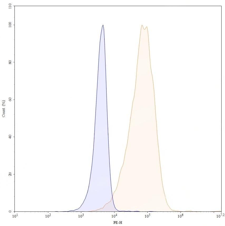 Flow-cytometry using PE anti-human CD151 antibody. Hela cells were stained with an irrelevant antibody (Blue Histogram) or an PE anti-human CD151 monoclonal antibody (Catalog No.:TD-HW567127, Yellow Histogram) at a concentration of 5 µg/ml for 30 mins at RT. After washing, and cells analysed on a NovoCyte Flow Cytometer.