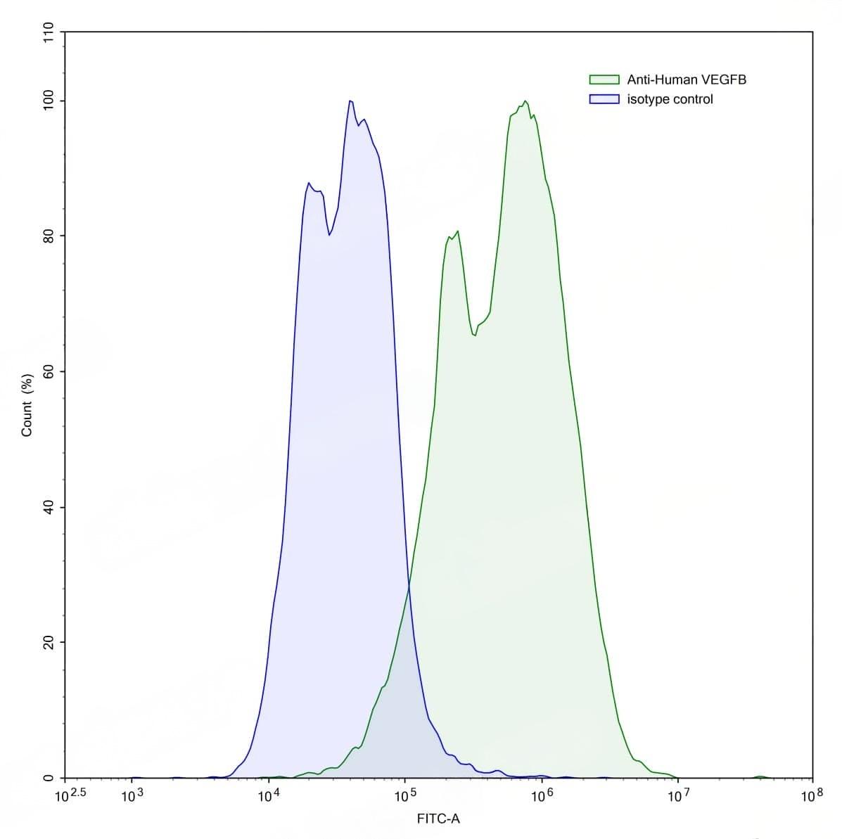 Flow-cytometry using anti-human VEGFB antibody.VEGFB Transfected CHO cells were stained with an irrelevant antibody (Blue Histogram) or an anti-human VEGFB antibody monoclonal antibody (Catalog No.:TD-HW516107 ,Green Histogram) at a concentration of 5 µg/ml for 30 mins at RT. After washing, bound antibody was detected using a FITC conjugated goat anti-mouse antibody (Catalog No.:TD-MF690414) and cells analysed on a NovoCyte Flow Cytometer.