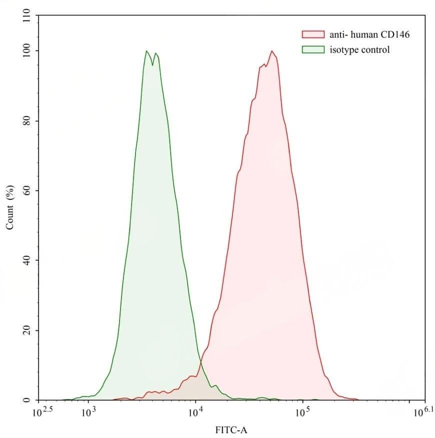 SEC-HPLC detection for Anti-Human CD146/MUC18/MCAM Antibody (ABS1541). | Flow-cytometry using anti-human CD146 antibody. Human HeLa cell line were stained with an irrelevant antibody (Green Histogram) or an anti-human CD146 antibody monoclonal antibody (Catalog No.:TD-HW484207 , Red Histogram) at a concentration of 5 µg/ml for 30 mins at RT. After washing, bound antibody was detected using a FITC conjugated goat anti-human antibody (Catalog No.:TD-HF690414) and cells analysed on a NovoCyte Flow Cytometer.