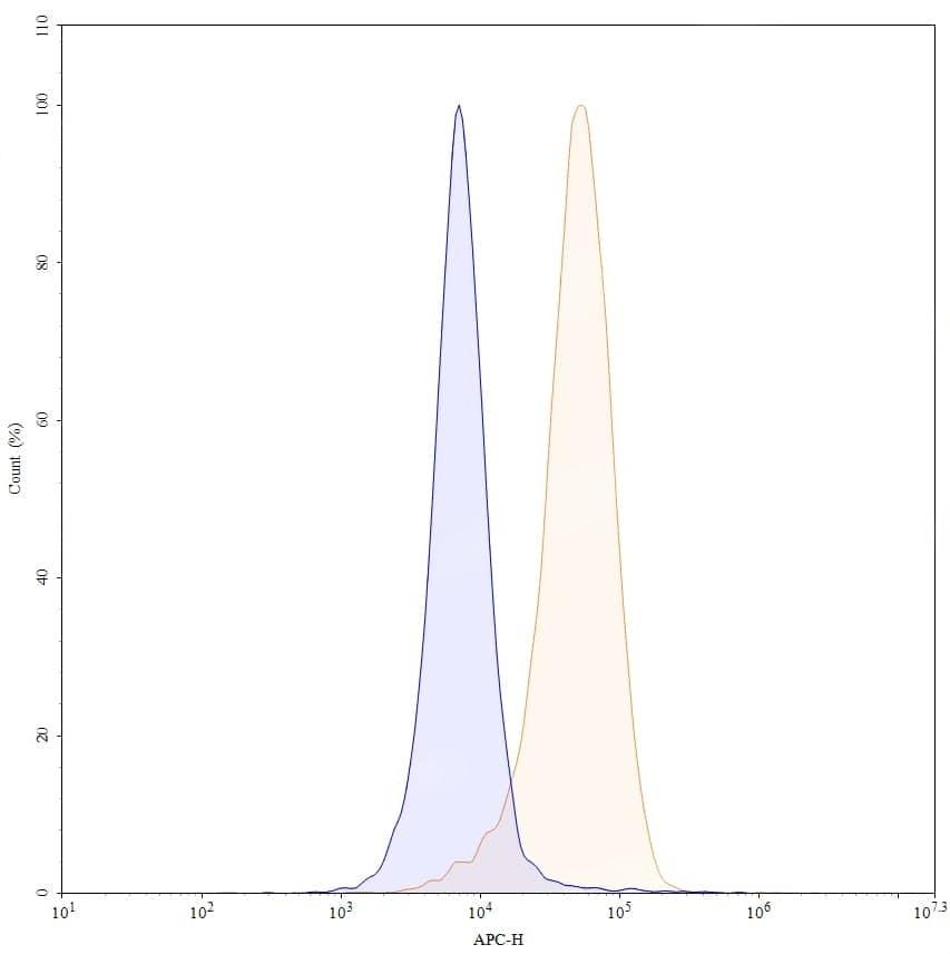 Flow-cytometry using APC anti-human CD146 antibody. Hela cells were stained with an irrelevant antibody (Blue Histogram) or an APC anti-human CD146 monoclonal antibody (Catalog No.:TD-HW484137, Yellow Histogram) at a concentration of 5 µg/ml for 30 mins at RT. After washing, and cells analysed on a NovoCyte Flow Cytometer.