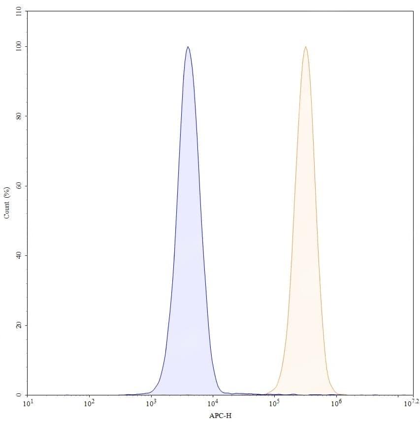 Flow-cytometry using APC anti-human CD50 antibody. RPMI-8226 cells were stained with an irrelevant antibody (Blue Histogram) or an APC anti-human CD50 monoclonal antibody (Catalog No.:TD-HW443137, Yellow Histogram) at a concentration of 5 µg/ml for 30 mins at RT. After washing, cells analysed on a NovoCyte Flow Cytometer.