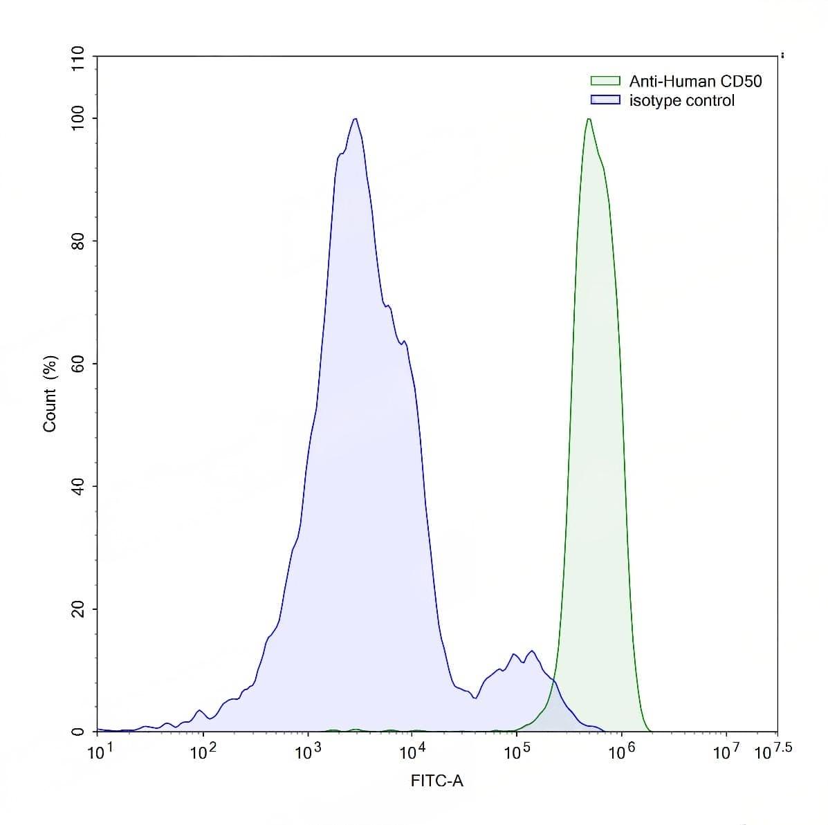 Detects Human CD50/ICAM3 in indirect ELISAs. | Flow-cytometry using anti-human CD50 antibody.RPMI-8226 cells were stained with an irrelevant antibody (Blue Histogram) or an anti-human CD50 antibody monoclonal antibody (Catalog No.:TD-HW443107 ,Green Histogram) at a concentration of 5 µg/ml for 30 mins at RT. After washing, bound antibody was detected using a FITC conjugated goat anti-mouse antibody (Catalog No.:TD-MF690414) and cells analysed on a NovoCyte Flow Cytometer. | Flow-cytometry using anti-human CD50 antibody.Human peripheral blood lymphocytes were stained with an irrelevant antibody (Blue Histogram) or an anti-human CD50 antibody monoclonal antibody (Catalog No.:TD-HW443107 ,Green Histogram) at a concentration of 5 µg/ml for 30 mins at RT. After washing, bound antibody was detected using a FITC conjugated goat anti-mouse antibody (Catalog No.:TD-MF690414) and cells analysed on a NovoCyte Flow Cytometer.