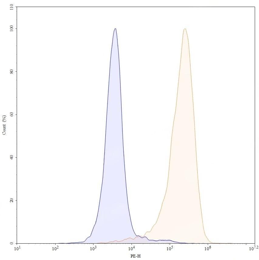 Flow-cytometry using PE anti-human CD79β antibody. Daudi cells were stained with an irrelevant antibody (Blue Histogram) or an PE anti-human CD79β monoclonal antibody (Catalog No.:TD-HW431227, Yellow Histogram) at a concentration of 5 µg/ml for 30 mins at RT. After washing, cells analysed on a NovoCyte Flow Cytometer.