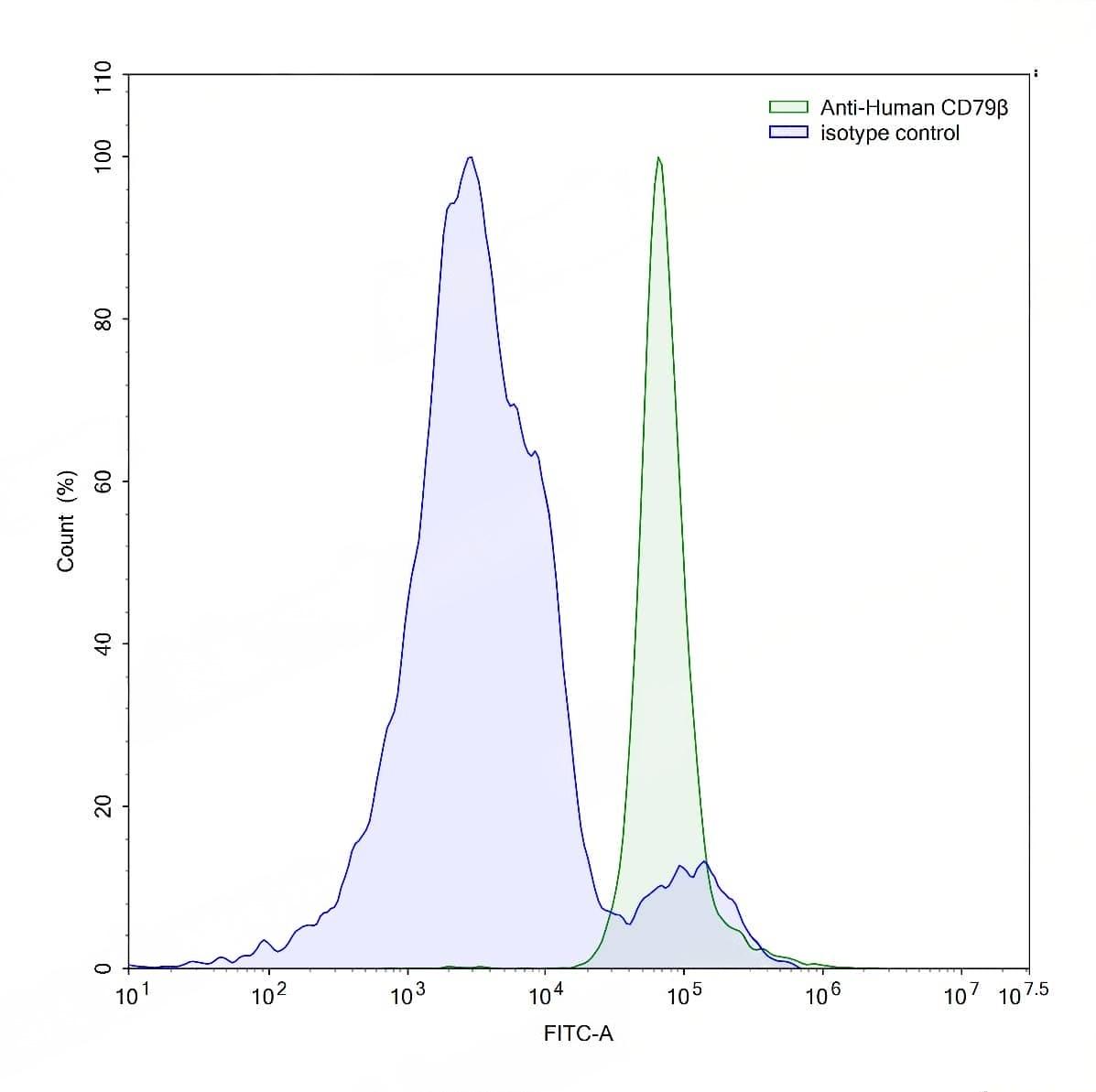 Detects CD79β/CD79B in indirect ELISAs. | Flow-cytometry using anti-human CD79β antibody.Daudi cells were stained with an irrelevant antibody (Blue Histogram) or an anti-human CD79β antibody monoclonal antibody (Catalog No.:TD-HW431207 ,Green Histogram) at a concentration of 5 µg/ml for 30 mins at RT. After washing, bound antibody was detected using a FITC conjugated goat anti-mouse antibody (Catalog No.:TD-MF690414) and cells analysed on a NovoCyte Flow Cytometer. | Flow-cytometry using anti-human CD79β antibody.Human peripheral blood lymphocytes were stained with an irrelevant antibody (Blue Histogram) or an anti-human CD79β antibody monoclonal antibody (Catalog No.:TD-HW431207 ,Green Histogram) at a concentration of 5 µg/ml for 30 mins at RT. After washing, bound antibody was detected using a FITC conjugated goat anti-mouse antibody (Catalog No.:TD-MF690414) and cells analysed on a NovoCyte Flow Cytometer.