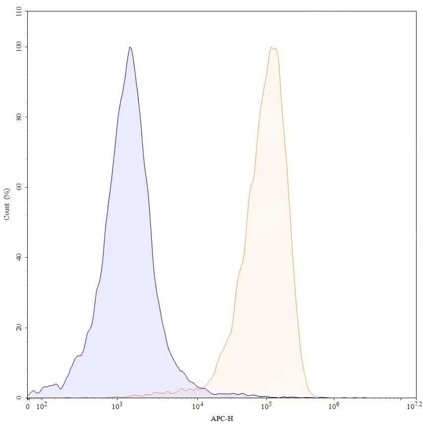 Flow-cytometry using APC anti-human CD79B antibody. Daudi cells were stained with an irrelevant antibody (Blue Histogram) or an APC anti-human CD79B monoclonal antibody (Catalog No.:TD-HW431137, Yellow Histogram) at a concentration of 5 µg/ml for 30 mins at RT. After washing, and cells analysed on a NovoCyte Flow Cytometer.