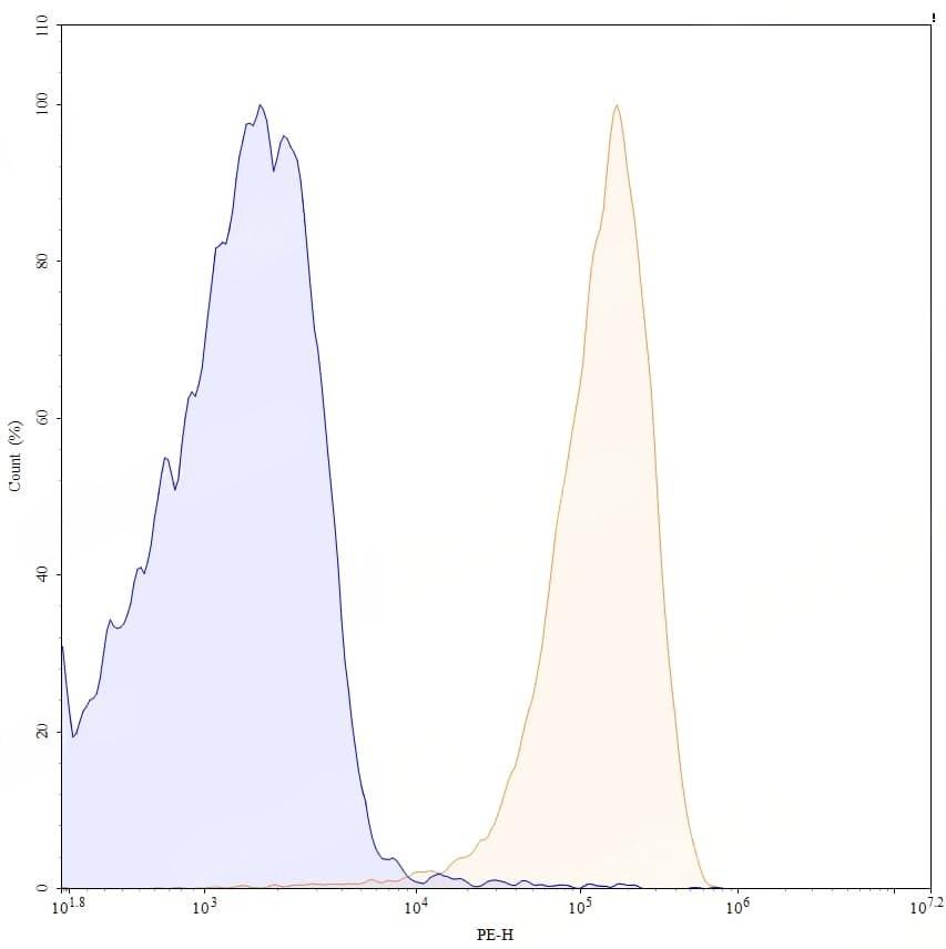 Flow-cytometry using PE anti-human CD79B antibody. Daudi cells were stained with an irrelevant antibody (Blue Histogram) or an PE anti-human CD79B monoclonal antibody (Catalog No.:TD-HW431127, Yellow Histogram) at a concentration of 5 µg/ml for 30 mins at RT. After washing, and cells analysed on a NovoCyte Flow Cytometer.