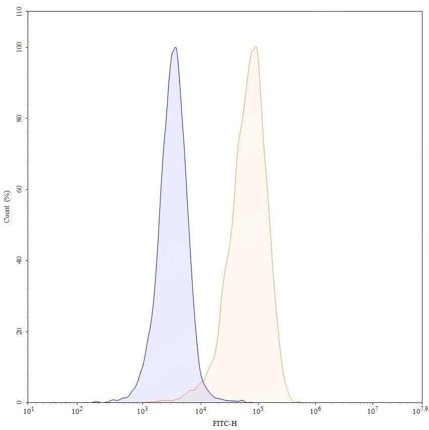 Flow-cytometry using FITC anti-human CD79B antibody. Daudi cells were stained with an irrelevant antibody (Blue Histogram) or an FITC anti-human CD79B monoclonal antibody (Catalog No.:TD-HW431117, Yellow Histogram) at a concentration of 5 µg/ml for 30 mins at RT. After washing, and cells analysed on a NovoCyte Flow Cytometer.