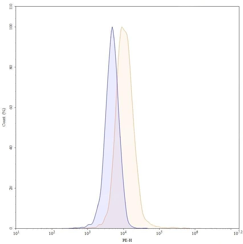Flow-cytometry using PE anti-human CXCL12 antibody. HepG-2 cells were fixed and permeabilized, then stained with an irrelevant antibody (Blue Histogram) or an PE anti-human CXCL12 monoclonal antibody (Catalog No.:TD-HW376127, Yellow Histogram) at a concentration of 5 µg/ml for 30 mins at RT. After washing, cells analysed on a NovoCyte Flow Cytometer.
