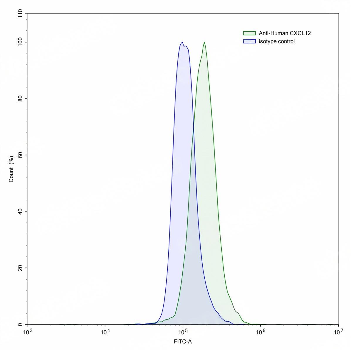 Flow-cytometry using anti-human CXCL12 antibody.MDA-MB-453 cells were stained with an irrelevant antibody (Blue Histogram) or an anti-human CXCL12 antibody monoclonal antibody (Catalog # TD-HW376107 ,Green Histogram) at a concentration of 5 µg/ml for 30 mins at RT. After washing, bound antibody was detected using a FITC conjugated goat anti-mouse antibody (Catalog # TD-MF690414) and cells analysed on a NovoCyte Flow Cytometer.