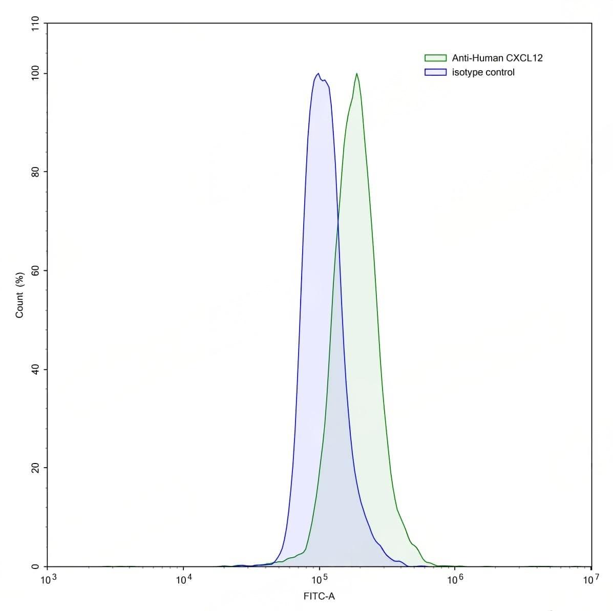 Detects Recombinant Human CXCL12/SDF-1 Protein (Cat No.:TD-HW376012) in indirect ELISA. | Flow-cytometry using anti-human CXCL12 antibody.MDA-MB-453 cells were stained with an irrelevant antibody (Blue Histogram) or an anti-human CXCL12 antibody monoclonal antibody (Catalog No.:TD-HW376107 ,Green Histogram) at a concentration of 5 µg/ml for 30 mins at RT. After washing, bound antibody was detected using a FITC conjugated goat anti-mouse antibody (Catalog No.:TD-MF690414) and cells analysed on a NovoCyte Flow Cytometer.