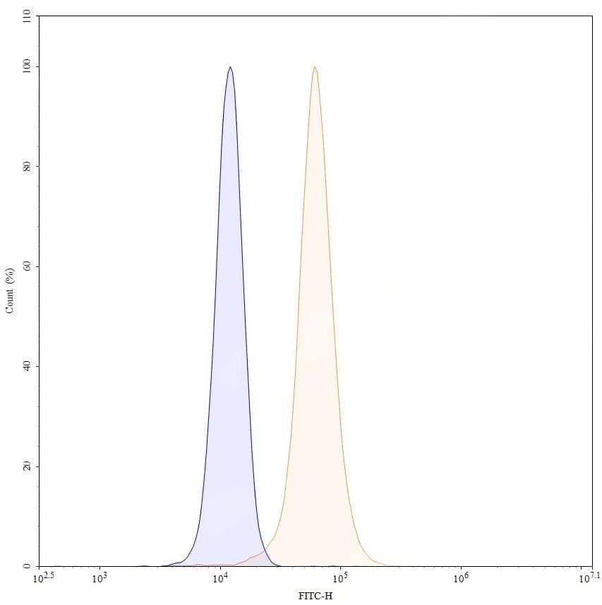 Flow-cytometry using FITC anti-human CD309 antibody. HUVEC cells were fixed and permeabilized, then stained with an irrelevant antibody (Blue Histogram) or an FITC anti-human CD309 monoclonal antibody (Catalog No.:TD-HW338217, Yellow Histogram) at a concentration of 5 µg/ml for 30 mins at RT. After washing, cells analysed on a NovoCyte Flow Cytometer.
