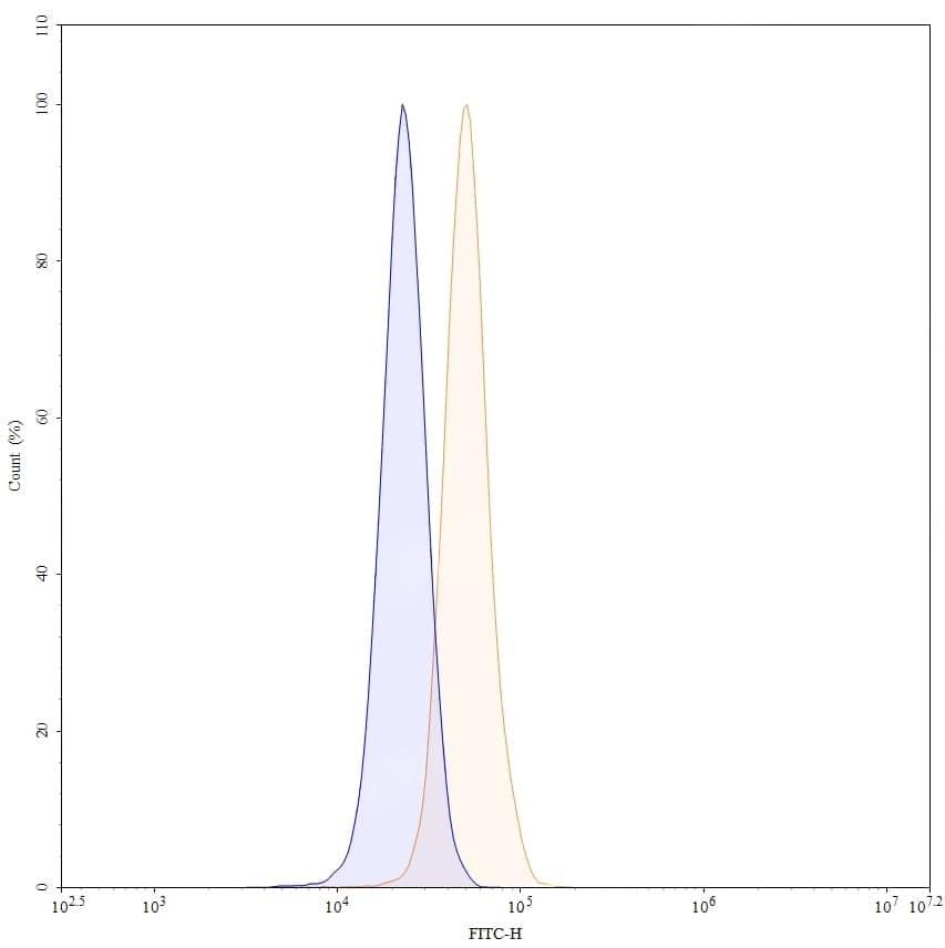 Flow-cytometry using FITC anti-human CD309 antibody. HUVEC cells were fixed and permeabilized, then stained with an irrelevant antibody (Blue Histogram) or an FITC anti-human CD309 monoclonal antibody (Catalog No.:TD-HW338117, Yellow Histogram) at a concentration of 5 µg/ml for 30 mins at RT. After washing, cells analysed on a NovoCyte Flow Cytometer.