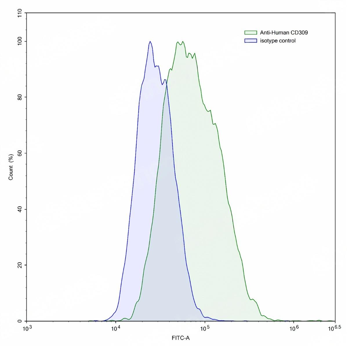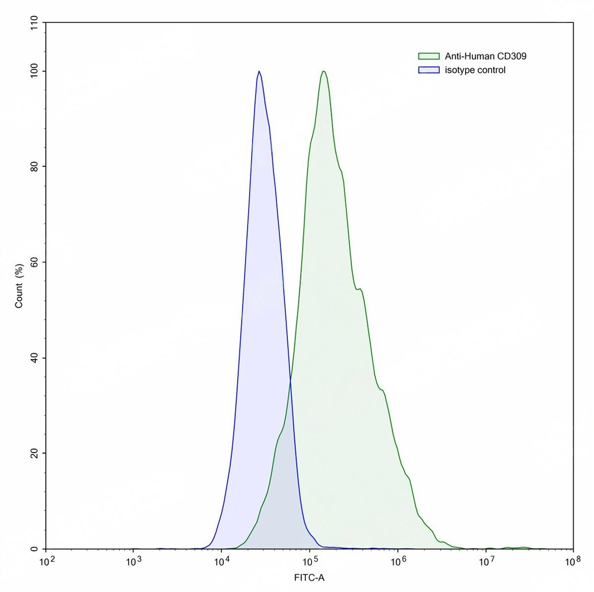 Flow-cytometry using anti-human CD309 antibody.CD309 Transfected CHO cells were stained with an irrelevant antibody (Blue Histogram) or an anti-human CD309 antibody monoclonal antibody (Catalog # TD-HW338107 ,Green Histogram) at a concentration of 5 µg/ml for 30 mins at RT. After washing, bound antibody was detected using a FITC conjugated goat anti-mouse antibody (Catalog # TD-MF690414) and cells analysed on a NovoCyte Flow Cytometer.