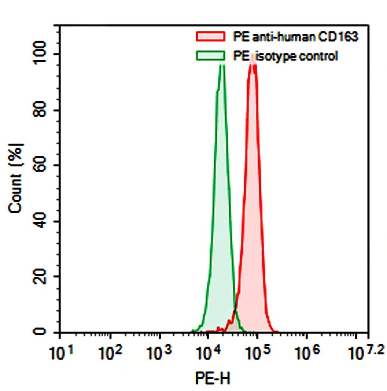 Flow-cytometry using PE anti-Human CD163 antibody. CACO-2 cells were stained with an irrelevant antibody (Green Histogram) or a PE anti-Human CD163 antibody monoclonal antibody (Catalog No.:TD-HV831227 , Red Histogram) at a concentration of 5 µg/ml for 30 mins at RT. After washing, cells analysed on a NovoCyte Flow Cytometer.