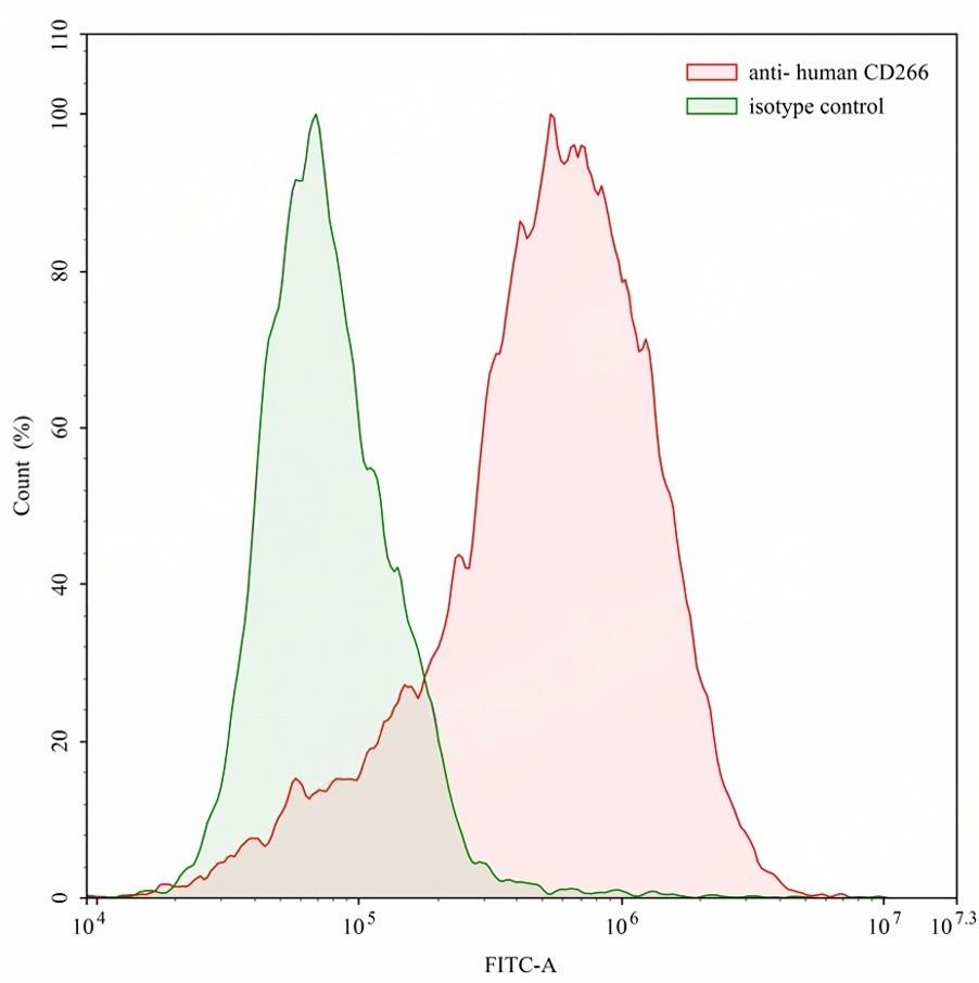 Flow-cytometry using anti-human CD266 antibody. Human U-251 cell line were stained with an irrelevant antibody (Green Histogram) or an anti-human CD266 antibody monoclonal antibody (Catalog # TD-HV811107 , Red Histogram) at a concentration of 20 µg/ml for 30 mins at RT. After washing, bound antibody was detected using a FITC conjugated goat anti-human antibody (Catalog # TD-HF690414) and cells analysed on a NovoCyte Flow Cytometer.