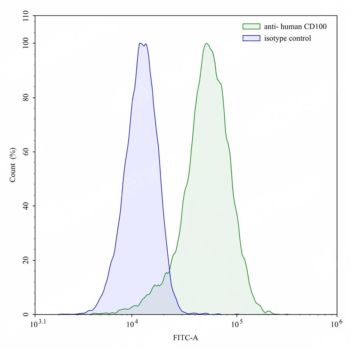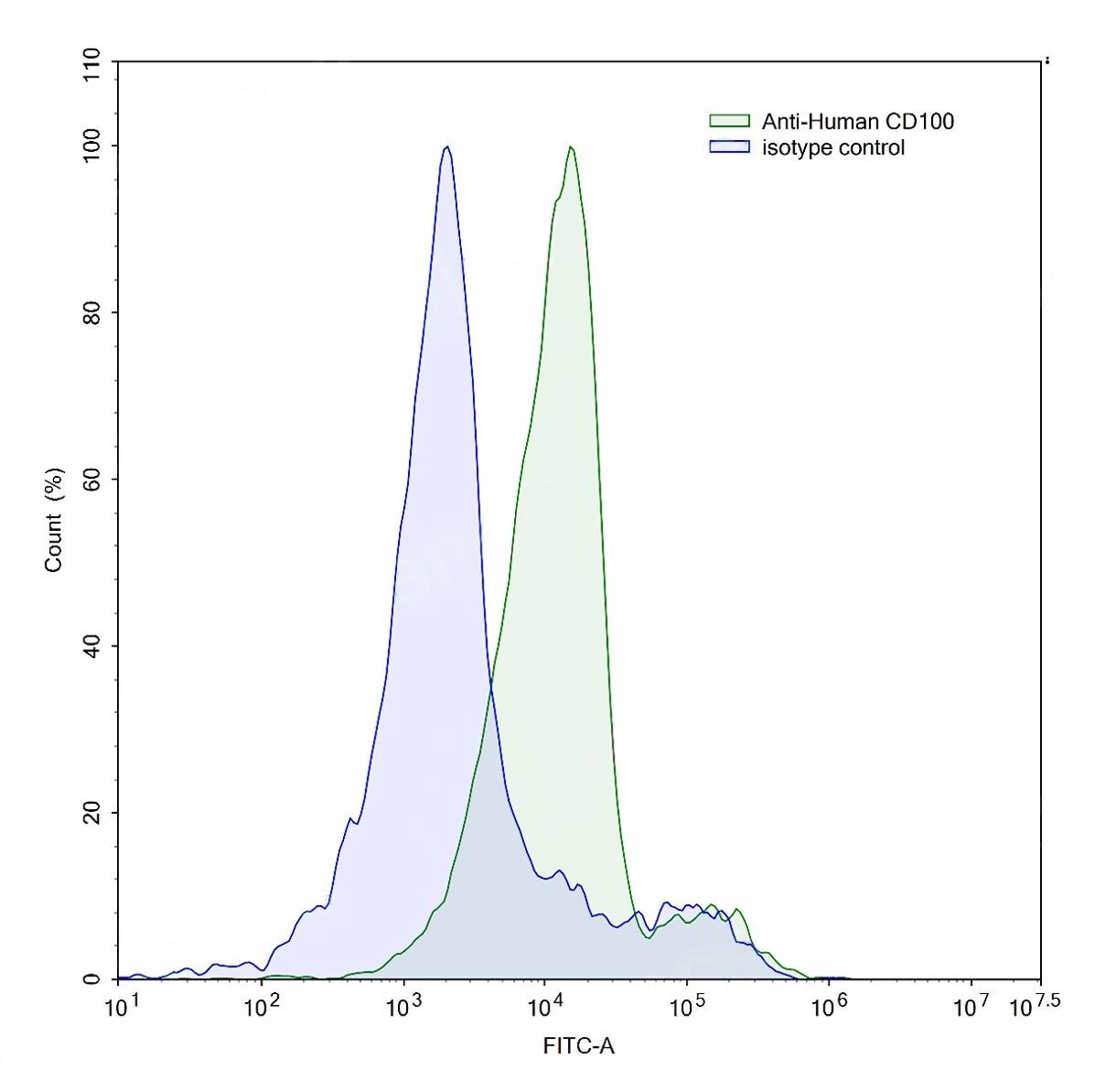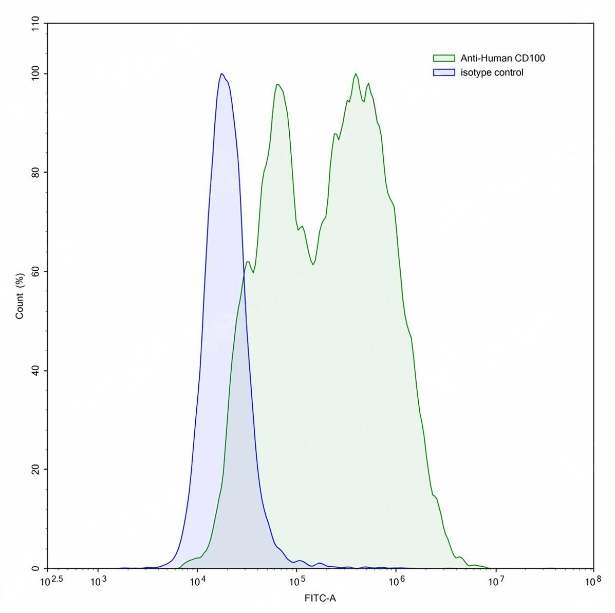 Flow-cytometry using anti-human CD100 antibody.Jurkat cells were stained with an irrelevant antibody (Blue Histogram) or an anti-human CD100 antibody monoclonal antibody (Catalog # TD-HV563107 ,Green Histogram) at a concentration of 5 µg/ml for 30 mins at RT. After washing, bound antibody was detected using a FITC conjugated goat anti-human antibody (Catalog # TD-HF690414) and cells analysed on a NovoCyte Flow Cytometer.