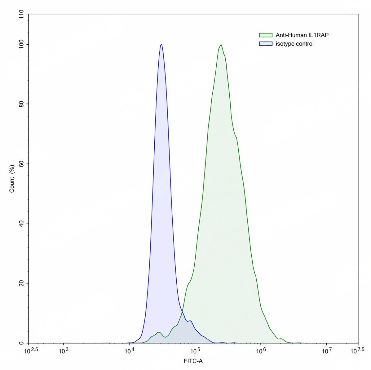 Flow-cytometry using anti-human IL1RAP antibody.IL1RAP Transfected CHO cells were stained with an irrelevant antibody (Blue Histogram) or an anti-human IL1RAP antibody monoclonal antibody (Catalog # TD-HV556107 ,Green Histogram) at a concentration of 5 µg/ml for 30 mins at RT. After washing, bound antibody was detected using a FITC conjugated goat anti-mouse antibody (Catalog # TD-MF690414) and cells analysed on a NovoCyte Flow Cytometer.