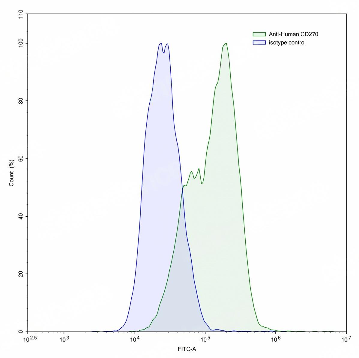 Flow-cytometry using anti-human CD270 antibody.CD270 Transfected CHO cells were stained with an irrelevant antibody (Blue Histogram) or an anti-human CD270 antibody monoclonal antibody (Catalog # TD-HV480107 ,Green Histogram) at a concentration of 5 µg/ml for 30 mins at RT. After washing, bound antibody was detected using a FITC conjugated goat anti-mouse antibody (Catalog # TD-MF690414) and cells analysed on a NovoCyte Flow Cytometer.