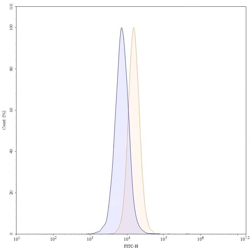 Flow-cytometry using FITC anti-human CD318 antibody. HT-29 cells were stained with an irrelevant antibody (Blue Histogram) or an FITC anti-human CD318 monoclonal antibody (Catalog No.:TD-HV451117, Yellow Histogram) at a concentration of 5 µg/ml for 30 mins at RT. After washing, cells analysed on a NovoCyte Flow Cytometer.