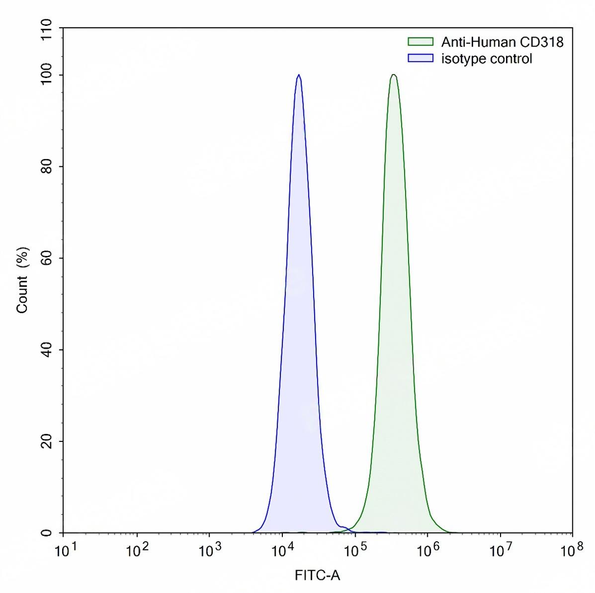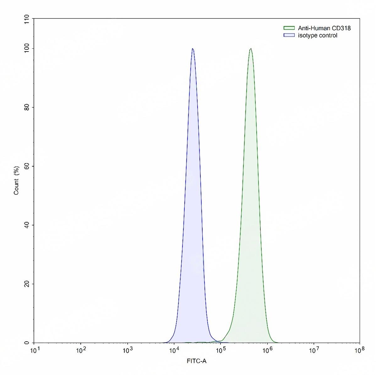 Flow-cytometry using anti-human CD318 antibody.SW480 cells were stained with an irrelevant antibody (Blue Histogram) or an anti-human CD318 antibody monoclonal antibody (Catalog # TD-HV451107 ,Green Histogram) at a concentration of 5 µg/ml for 30 mins at RT. After washing, bound antibody was detected using a FITC conjugated goat anti-mouse antibody (Catalog # TD-MF690414) and cells analysed on a NovoCyte Flow Cytometer.