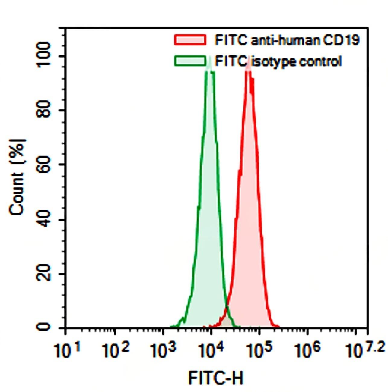 Flow-cytometry using FITC anti-Human CD19 antibody. Raji cells were stained with an irrelevant antibody (Green Histogram) or a FITC anti-Human CD19 antibody monoclonal antibody (Catalog No.:TD-HV426117 , Red Histogram) at a concentration of 5 µg/ml for 30 mins at RT. After washing, cells analysed on a NovoCyte Flow Cytometer.