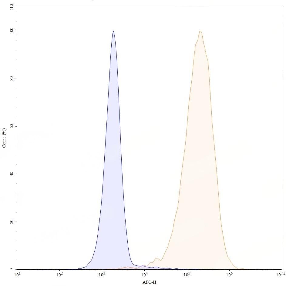 Flow-cytometry APC using anti-human CD272 antibody. Untransfected cells (blue Histogram) and Transfected cells (Yellow Histogram) were stained with an APC anti-human CD272 monoclonal antibody (Catalog No.:TD-HV375137) at a concentration of 5 µg/ml for 30 mins at RT. After washing, cells analysed on a NovoCyte Flow Cytometer.