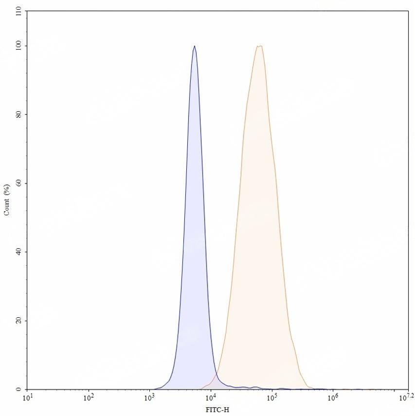 Flow-cytometry using anti-human CD93 antibody. U937 cells were stained with an irrelevant antibody (Blue Histogram) or an anti-human CD93 monoclonal antibody (Catalog: TD-HV345207, Yellow Histogram) at a concentration of 5 µg/ml for 30 mins at RT. After washing, bound antibody was detected using a Goat Anti-Mouse IgG H&L Polyclonal Antibody, FITC (Catalog: TD-MF690414) and cells analysed on a NovoCyte Flow Cytometer.