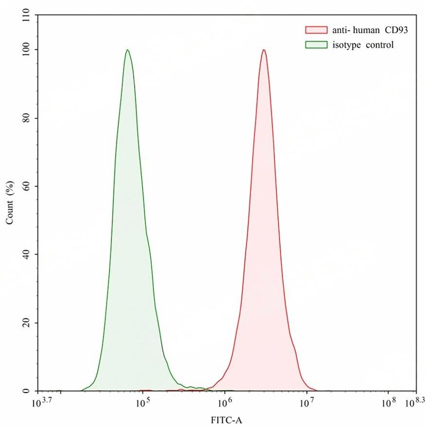Flow-cytometry using anti-human CD93 antibody. Human U-937 cell line were stained with an irrelevant antibody (Green Histogram) or an anti-human CD93 antibody monoclonal antibody (Catalog # TD-HV345107 , Red Histogram) at a concentration of 20 µg/ml for 30 mins at RT. After washing, bound antibody was detected using a CoraLite488 conjugated goat anti-mouse antibody (Catalog # TD-MF690314) and cells analysed on a NovoCyte Flow Cytometer.